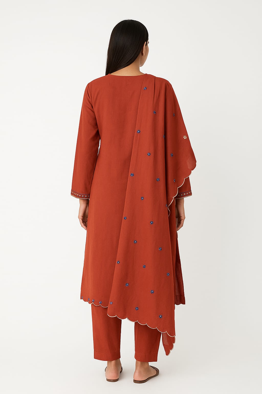 Rust Orange Cotton Embroidered Kurta Set with Dupatta for Women